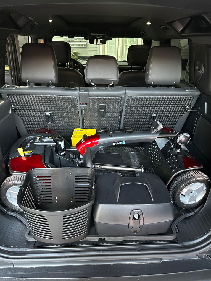 To maximize space in an SUV, place the scooter on its side and remove the basket. This allows you to use all three rows of seats and still fit the scooter.